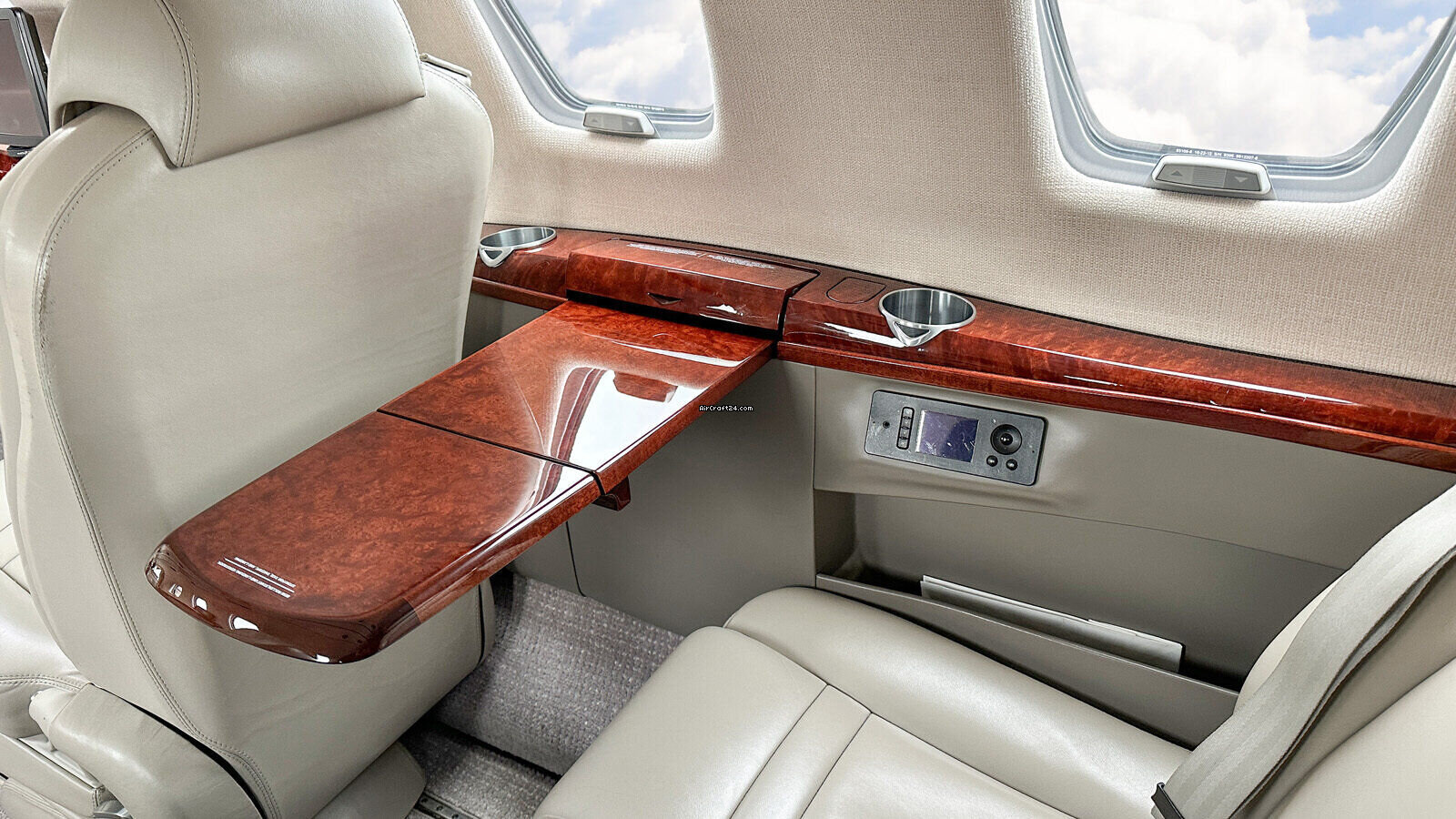 | Interior | | 2 Crew-, 4 Club Seats; 2 single fwd. Seats, double seat Divan (Couch) and belted Toilet Seat (max. 9 Pax), AC Power Outlets, Lavatory with sliding door for privacy, 2 additional foldable slimline Tables on seat 7 & 8, Satcom Telephone, Airshow with Media Center and 2 additional Table Screens, Hot Coffee Bar, electric Window shades. |